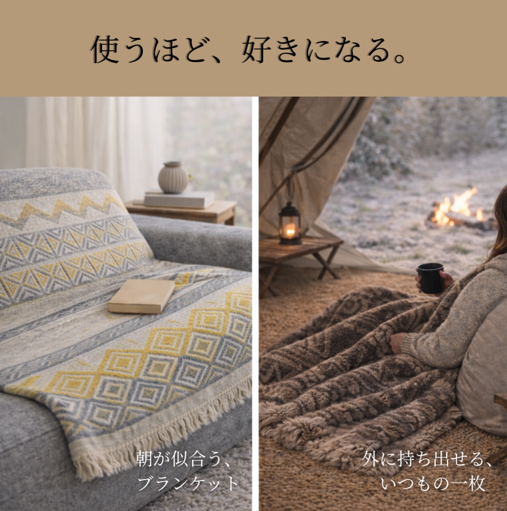 ひざ掛けとしても暖かく、ソファに掛けても絵になります。
